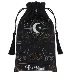 Piękny, aksamitny woreczek na karty tarota w głębokim odcieniu czerni z eleganckim złotym haftem przedstawiającym księżyc otoczony promieniami, dłońmi oraz dwoma wilkami, symbolizującymi intuicję i wewnętrzną mądrość. Woreczek zapewnia nie tylko estetyczne przechowywanie kart tarota, ale także chroni je przed uszkodzeniami i negatywną energią. Wykonany z wysokiej jakości materiału, posiada ściągacz z ozdobnymi chwostami, który ułatwia zamykanie i otwieranie. Idealny dla pasjonatów ezoteryki, magii i wróżb, którzy cenią praktyczne i piękne akcesoria.