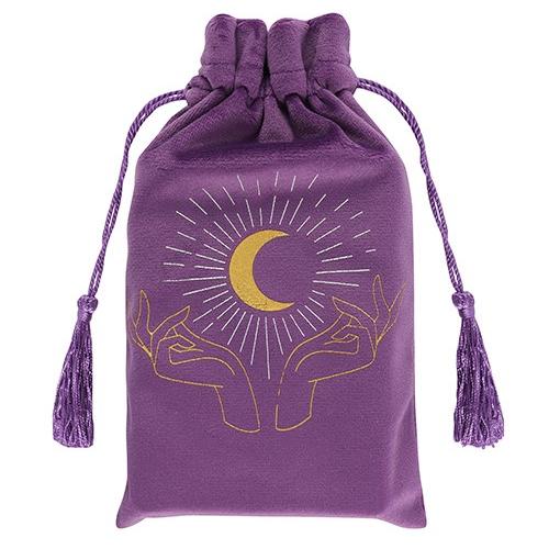 Piękny, aksamitny woreczek na karty tarota w głębokim odcieniu fioletu z eleganckim złotym haftem przedstawiającym księżyc w otoczeniu promieni i dłoni. Woreczek zapewnia nie tylko estetyczne przechowywanie kart tarota, ale także chroni je przed uszkodzeniami i negatywną energią. Wykonany z wysokiej jakości materiału, posiada ściągacz z ozdobnymi chwostami, który ułatwia zamykanie i otwieranie. Idealny dla pasjonatów ezoteryki, magii i wróżb, którzy cenią praktyczne i piękne akcesoria.