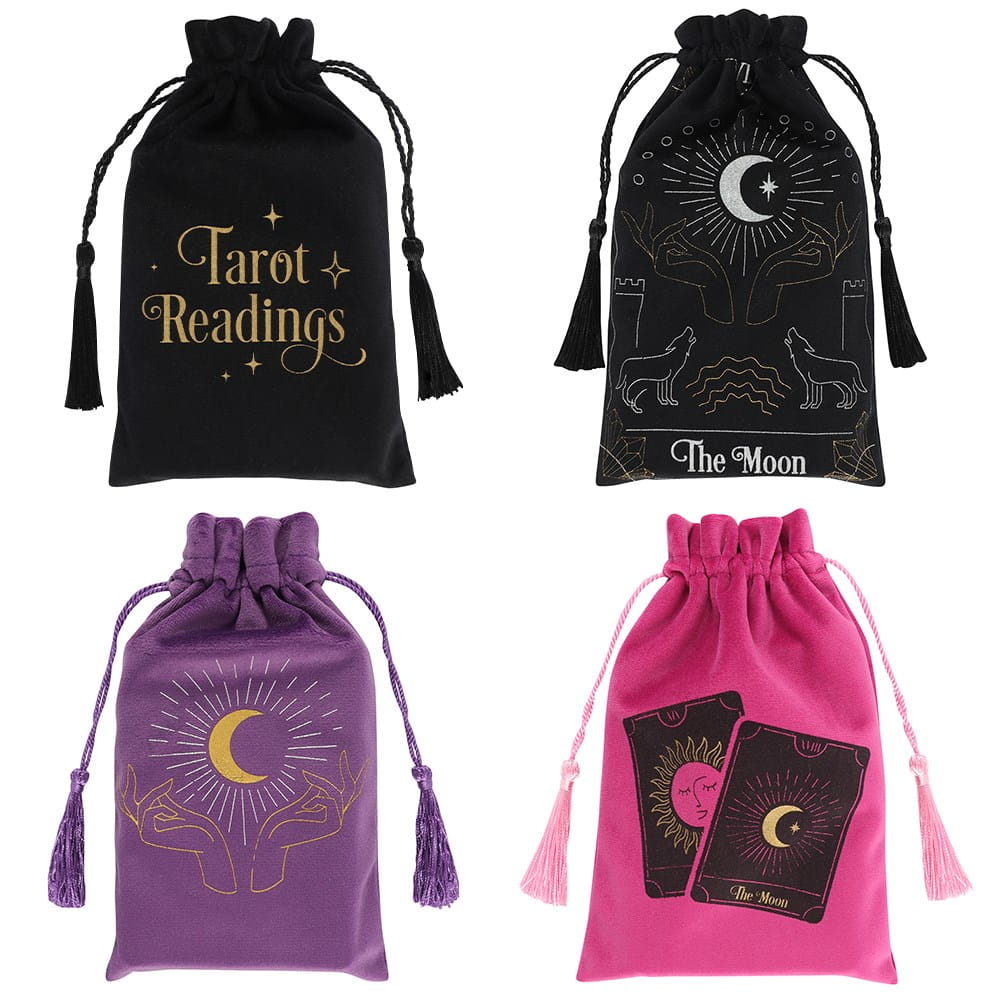 Aksamitny woreczek ze ściągaczem. Idealne miejsce do przechowywania talii tarota i kart wyroczni, gdy nie są używane. Miękki i luksusowy z oszałamiającymi, mistycznymi wzorami z przodu.