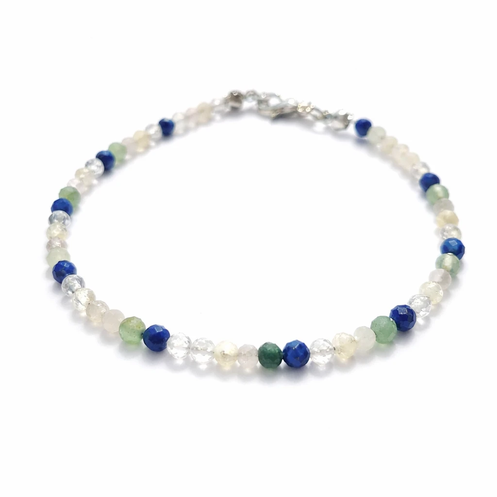 Bransoletka z Lapis Lazuli, Kryształu Górskiego, Cytrynu, Kamienia Księżycowego i Zielonego Fluorytu – harmonia żywiołów, jasność umysłu, opieka duszy