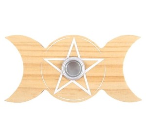 Drewniany świecznik w kształcie potrójnego Księżyca z Pentagramem