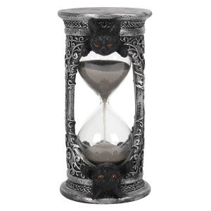 Gotycka klepsydra z motywem czarnych kotów, pentagramów i misternych zdobień w srebrnym wykończeniu. Symbolizuje ochronę, cykl życia i duchową świadomość przemijania. Czas przesypuje się przez około 60 sekund – idealna do rytuałów, medytacji i magicznych praktyk.