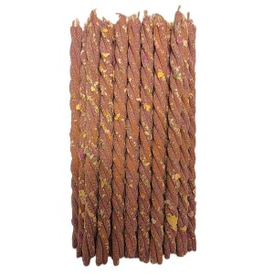 Każda świeca jest unikalna, ręcznie wykonana, z widocznymi drobinkami roślin i płatków, co podkreśla jej naturalny, rytualny charakter.