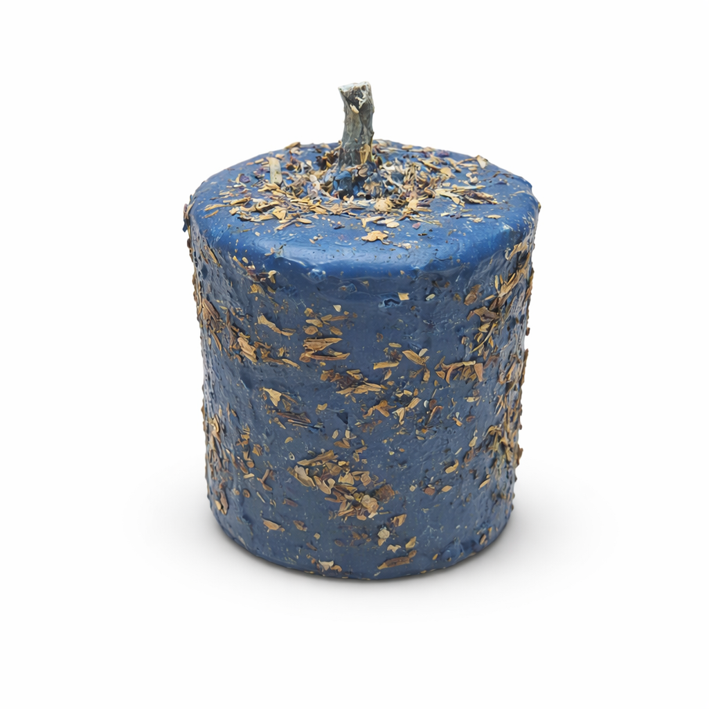 Niebieska świeca czakralna handmade z wosku pszczelego i ziół. 5 cm wysokości, 4,7 cm średnicy. Symbol komunikacji, spokoju i prawdy.